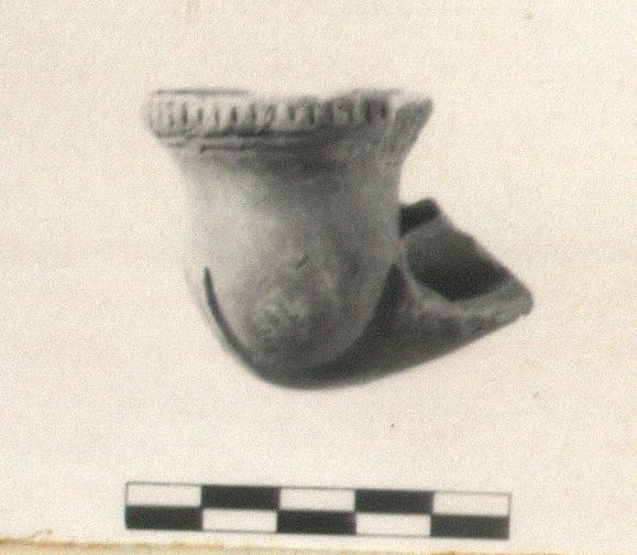 | Description: | Stem socket broken away; rim chipped; bowl use-blackened inside. Bowl of a lily pipe with emphasized keel running under entire bowl and up front where it forms a decorative element. Heavy lip with vertical striations above a ring or collar. Orange clay, red slip. | |