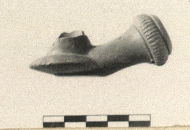 | Description: | Rim broken away. It has a bowl condensed to a disk; flat square foot; high flared cup-like rim now mostly missing. Long stem socket with large swelling at stem end with moulded striations. Reddish brown clay, red slip, burnished but worn. | |