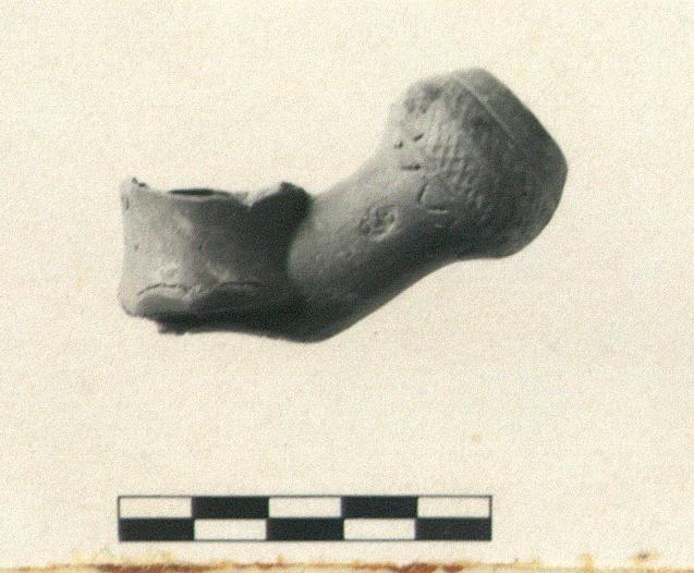 | Description: | Rim broken away. Interior of bowl use-blackened. Pipe combining features of several types-small bowl flat on bottom, squared foot with concave lower surface, swollen stem socket. Identical with MC 1293 in every respect except that the identical seal is applied the other way up, and a slightly different pattern is stamped on the front of the bowl. Orange clay, red slip. | |