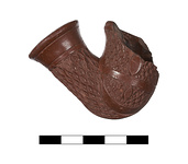 | Description: | Two large pieces missing from rim. It is of lily type (rim and bowl are in one; acute angle between axis of bowl and axis of stem socket) with flaring rim and thickened lip and flaring stem socket. On undersurface of stem end of socket is a seal, tentatively read by N. Stravoulakis as N A K I or T I K A. Decoration consists of elaborate impressed feather or scale pattern over entire pipe except for reserved zones around lip and body and end of stem socket. Dark red clay and slip, burnished to a high glass. <graphic> | |