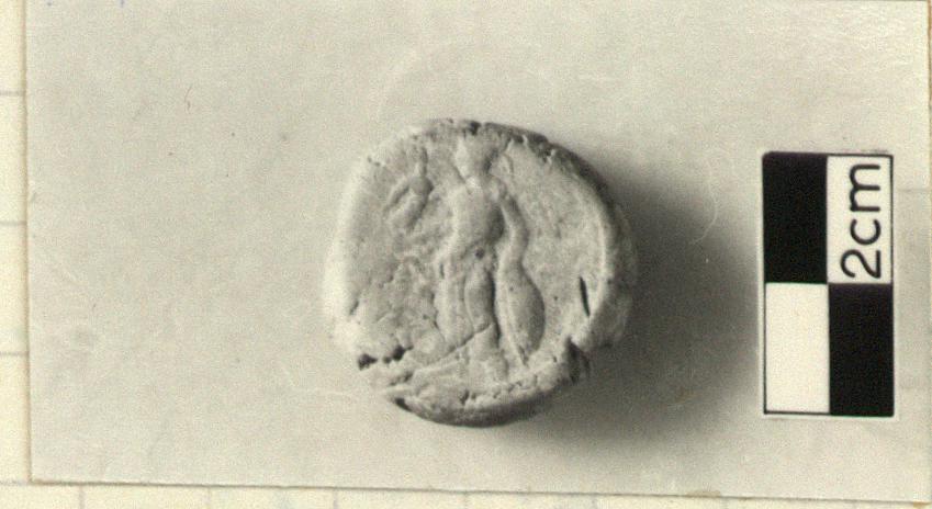 | Description: | Complete fired clay disk with irregular edges. Side A: standing Athena Parthenos with shield by her proper left side and Nike in her out-stretched hand. The accompanying serpent is displaced from its usual position inside the shield to the space beneath the Nike. Side B: plain. Cf. LIMC II, Athena 216, 217, where Parthenos appears on roughly contemporary coins of Side and Aphrodisias. See also Agora X, pp. 117-118, pl. 30, nos. L 301, L 303. | |