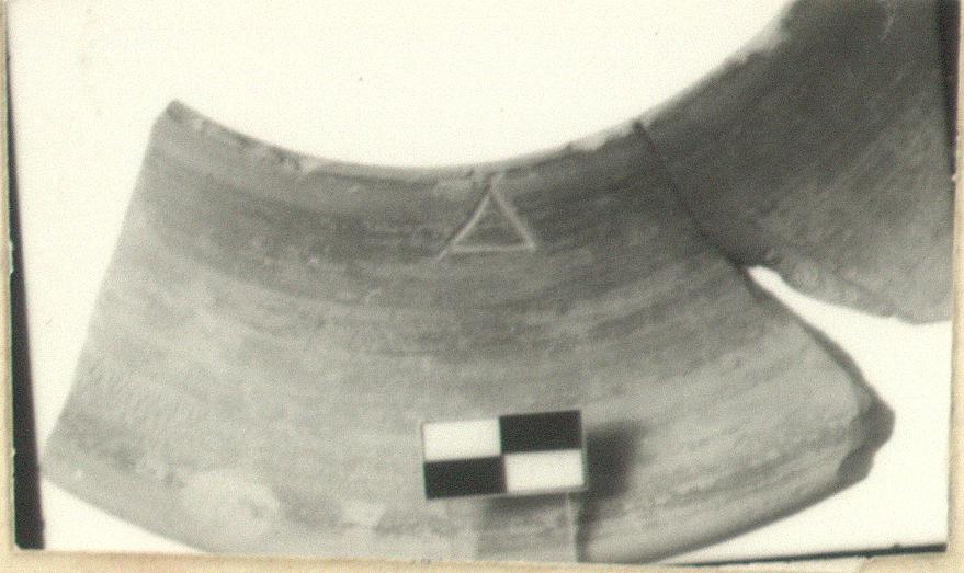 | Description: | Little more than one quarter preserved; broken at both ends. Mended from three fragments. Inscribed. Deeply concave wall. On the outside, at the top, the letter "Δ" inscribed before firing. Light buff slip. Reddish-brown glaze on the outside, on the inner edge, on the upper half of the inside. Very fine, hard, reddish clay. | |