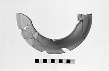 | Description: | One-half preserved; broken at both ends. Mended from eleven fragments. Ring with flat base and concave wall. Light buff slip. Reddish glaze on the inner edge. Very fine, hard, reddish clay. | |