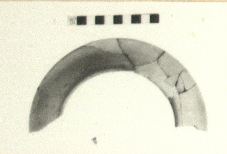 | Description: | One-half preserved; broken at both ends. Mended from nine fragments. It has flat base and concave wall. Buff slip. Reddish glaze on the inner edge. Very fine, hard, reddish clay. | |