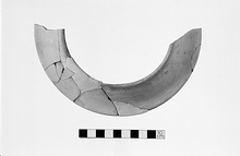 | Description: | One-half preserved; broken at both ends. Mended from nine fragments. It has flat base and concave wall. Buff slip. Reddish glaze on the inner edge. Very fine, hard, reddish clay. | |