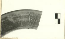 | Description: | One quarter preserved; broken at both ends. Mended from two fragments. Inscribed. Straight wall. On the outer side the letter "A" is inscribed before firing. Buff slip. Worn black glaze on both sides. Very fine, hard, reddish clay. | |