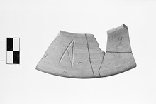 | Description: | Small section of ring preserved; broken at both ends. Mended from four fragments. Inscribed. Wall concave on exterior, straight on interior. On the outside the letter "A" and part of another letter inscribed before firing. Light buff slip on both sides. Very fine, hard, reddish clay. | |