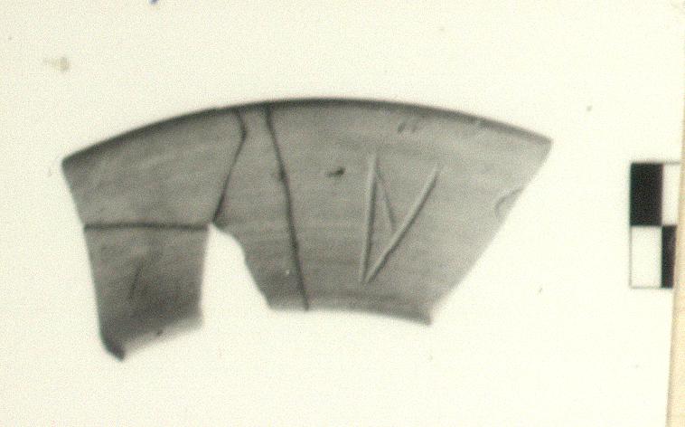 | Description: | Small section of ring preserved; broken at both ends. Mended from four fragments. Inscribed. Wall concave on exterior, straight on interior. On the outside the letter "A" and part of another letter inscribed before firing. Light buff slip on both sides. Very fine, hard, reddish clay. | |