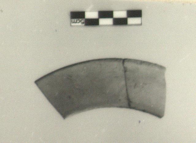 | Description: | Less than one quarter preserved; broken at both ends. Mended from two fragments. Exterior wall concave, interior straight. Light buff slip on both sides. Traces of black glaze on the inner edge. Very fine, hard, reddish clay. | |