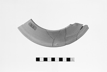 | Description: | One quarter preserved; broken at both ends. Mended from six fragments. Interior wall straight, exterior concave with slightly outturned base. Light buff-orange slip on inside and outer part of base. Very fine, hard, reddish clay. | |