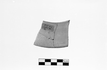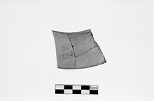 | Description: | Small section preserved; broken at both ends. Mended from three fragments. Exterior wall slightly concave, interior straight. Ridge on inner edge. Light buff slip on inside, orange on outer part of base. Scattered drops of black glaze. Very fine, hard, reddish clay. | |