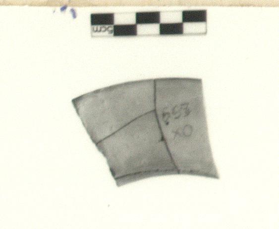 | Description: | Small section preserved; broken at both ends. Mended from three fragments. Exterior wall slightly concave, interior straight. Ridge on inner edge. Light buff slip on inside, orange on outer part of base. Scattered drops of black glaze. Very fine, hard, reddish clay. | |