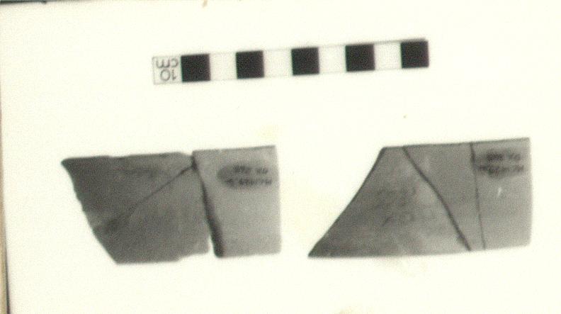 | Description: | Two non-joining fragments broken at both ends. Both mended from three fragments. Straight vertical wall with one edge rounded, the other one flat (evidently cut) with thin inner ridge. On fragment b) a circular cutting preserved near flat edge. Dull black glaze on interior wall and flat edge. Very fine, hard, pink-yellow clay. | |