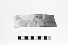 | Description: | Mended from seven fragments, broken at both ends. Restored in plaster. Straight vertical wall with one rounded edge, the other flat (evidently cut) with thin inner ridge. Remains of a vertical cutting close to rounded edge. Dilute black glaze on interior wall and part of flat edge. Very fine, hard, reddish clay. | |