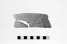 | Description: | Mended from nine fragments; one non-joining fragment. Straight vertical wall with one edge rounded, the other flat (evidently cut) with thin inner ridge. On both fragments remains of sharp cutting at one end. Faint traces of white slip. Very fine, hard, pinkish-reddish clay. | |