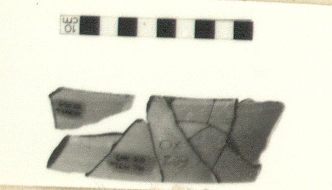 | Description: | Mended from nine fragments; one non-joining fragment. Straight vertical wall with one edge rounded, the other flat (evidently cut) with thin inner ridge. On both fragments remains of sharp cutting at one end. Faint traces of white slip. Very fine, hard, pinkish-reddish clay. | |