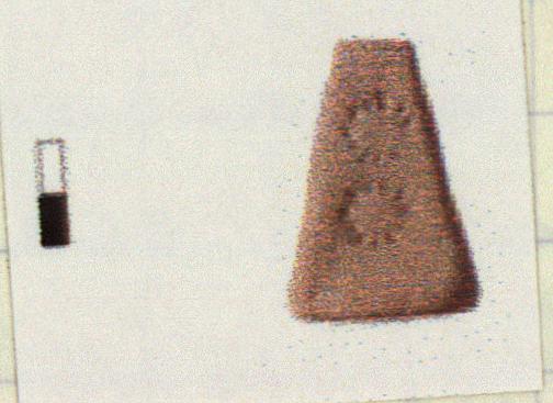| Description: | Intact. Pyramidal, stamped. Flat top and bottom. Single suspension hole pierced near top. Stamped on four sides and top with star pattern. Two to three per side; one on top. No glaze. Orange fabric. | |