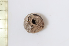 | Description: | Spherical, pierced vertically. Slightly diagonal vertical grooves. Soft clay, burned and somewhat chipped. | |