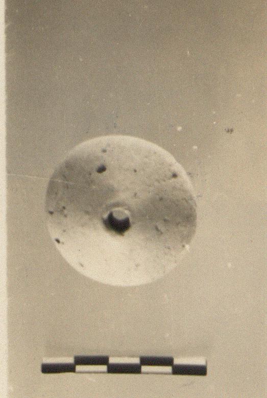 | Description: | Flattened double-conical shape, pierced vertically. Greenish gray clay. Similar to MC 303. | |