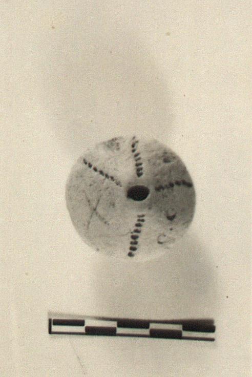 One side decorated with four rows of incised dots, two small stamped (?) rings, and an incised cross.