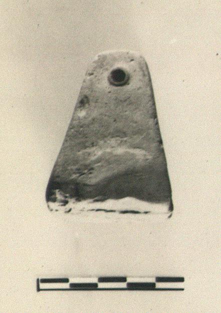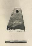 | Description: | Truncated pyramid. Smoothed surface. A streak of glaze, worn, over the top and down the two unpierced faces. Fine pinkish buff clay. | |
