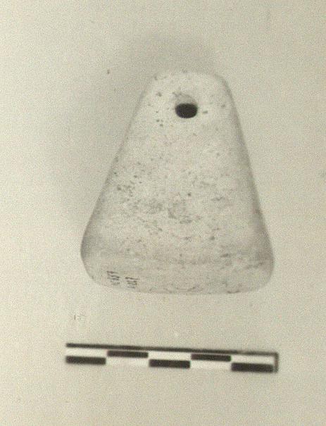| Description: | Intact, save for minor chips. Pyramidal. In addition to the usual horizontal hole near top, there is a vertical hole in top which does not quite connect with horizontal hole. Buff clay. | |
