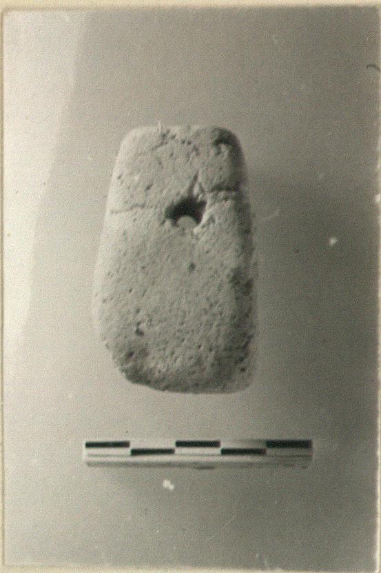 | Description: | Most of the lower part missing, but the full height preserved. Truncated pyramid. The sides tapering only very slightly. Pierced well below the top. Unglazed. Coarse yellow to gray-buff clay with grits. | |