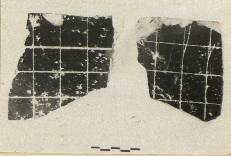 | Description: | Two non-joining fragments from edge of slab. Front smoothly finished and incised in squares. Back smooth with three small holes along edge for attachment on fragment a) and three along the break on fragment b). The letters: A X incised between two of the holes on fragment a). On the front the finished edge is flat; on the back it projects slightly. Along the vertical face, a simple deep groove. Heavy rather dull black glaze over all. Dark buff clay, micaceous. | |
