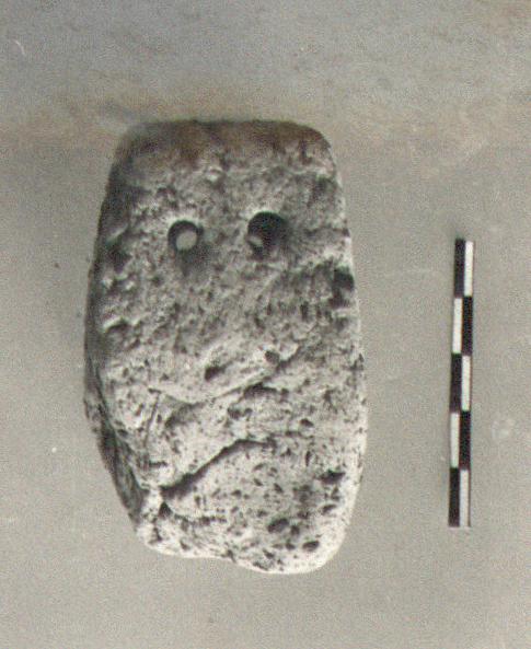 | Description: | Base missing, and flakes from sides. Pyramidal-rectangular in section, and truncated. Pierced twice near the top. Greenish yellow clay, with dark specks; the surface is soft and gritty. | |