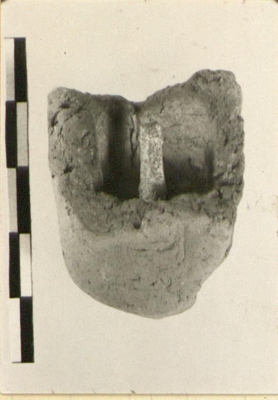 | Description: | Rounded bottom of a clay mold for metal object (?) Bronze pin stuck into bottom. Coarse clay, red on outside, blackened from fire on inside. See note on P 22794. | |