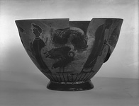 Beneath one handle, a goose with raised wings; beneath the other, a cock(?) with head turned back over its shoulder. On either side, between the handles, appears a similar scene: a youth riding a hippalektryon, facing right. On each side of the rider is a standing draped figure looking toward him, their further hands held in front of the figure and covered with drapery. The riders wear short jerkins. Added purple is used for the head-bands with long pendent ends of the standing figures, for the caps of the riders, for the necks and rumps of the hippalektryons, for a stripe on the wings of each of the birds, and for the long garment of one of the spectators. Traces of added white remain on the jerkin of one of the riders, and on the outstretched drapery of the figure facing him. Incision careless and sparing. Inside black glazed.