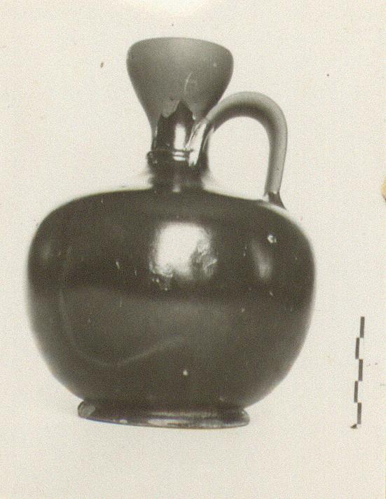 | Description: | Squat round body on ring foot; narrow neck with a raised ring around its bottom and one band handle, shoulder to neck. Good black glaze. | |