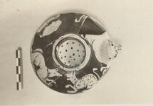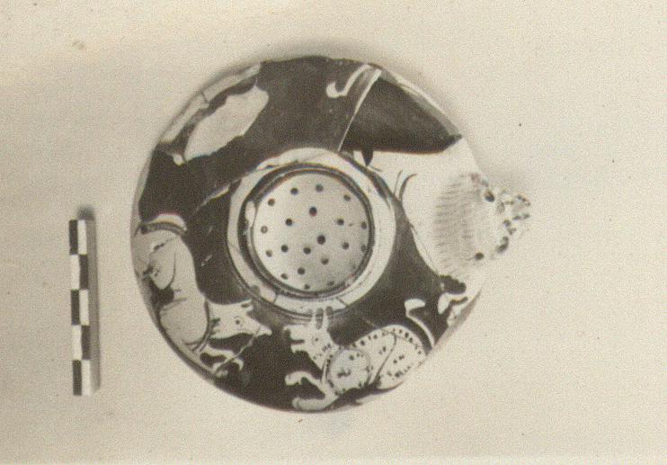 | Description: | Strainer top, depressed; flat bottom; the ring handle missing, and fragments of side and bottom. Restored in plaster. At right angles to the handle, a spout in the shape of a lion's head, the lion's body sketchily rendered in red figure. Also represented on the top, a seated dog and a griffin, facing each other. No relief contours. | |