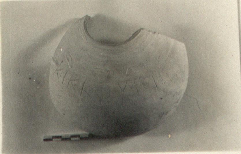 | Description: | From the shoulder of a closed pot, slipped outside. Incised outside: <graphic> | |