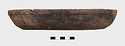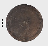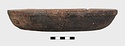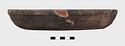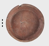 Description:   Mended from many pieces; small fragment of rim missing; minor fractures at edge of breaks. Flat bottom; curving sides; flat-topped rim, slightly sloping inward. Interior: good dull red glaze. Exterior unglazed, blackened by fire.