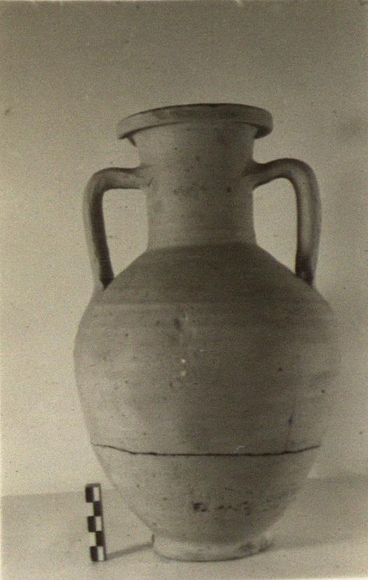| Description: | Mended from several pieces; fragment of body missing. Ring foot; wide straight neck; projecting lip with vertical edge; "double" handles, from middle of neck to shoulder. Buff clay. Light buff slip. | |