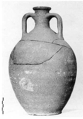 Description:   Mended from many pieces; three fragments missing from body. Ring foot formed by a continuation of wall; egg-shaped body; narrow neck; small projecting lip; band handles, from middle of neck to shoulder.