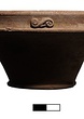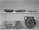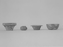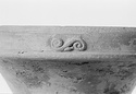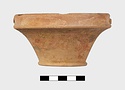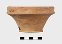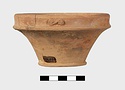 Description:   Cracked, but intact save for minor fractures. A kalathos-shaped bowl with vertical rim and low ring foot. On outside of rim, on opposite sides, two reverse scrolls in relief.