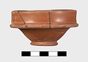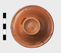 | Description: | Mended from a number of pieces; fragments of keeled rim missing. Small low ring foot. Under foot, a graffito: <graphic> Buff clay, rather like "Attic". Orange-red glaze, quite firm. Cf. Agora XXXII, no. 778 (P 9171). | |