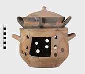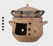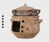 | Description: | About half missing. Restored in plaster. Small plain domed lid with plain knob handle. Micaceous red clay. Unglazed. | |