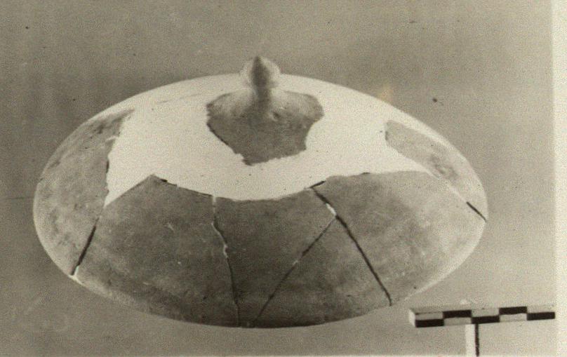 Description:   About half missing. Restored in plaster. Small plain domed lid with plain knob handle.