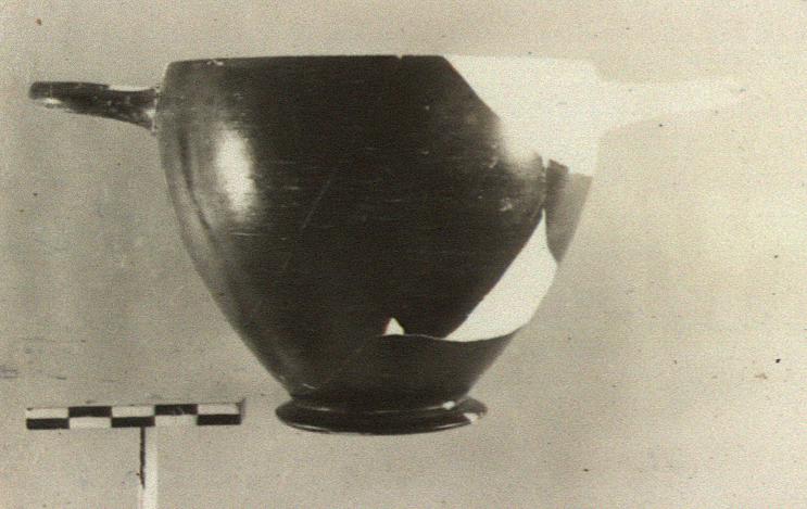 | Description: | Fragments of rim and wall, with one handle and part of the other missing; restored in plaster. Flaring ring foot; walls drawn in at base, slightly at rim. Glazed over all, save for a narrow reserved band at junction of foot and underside. | |