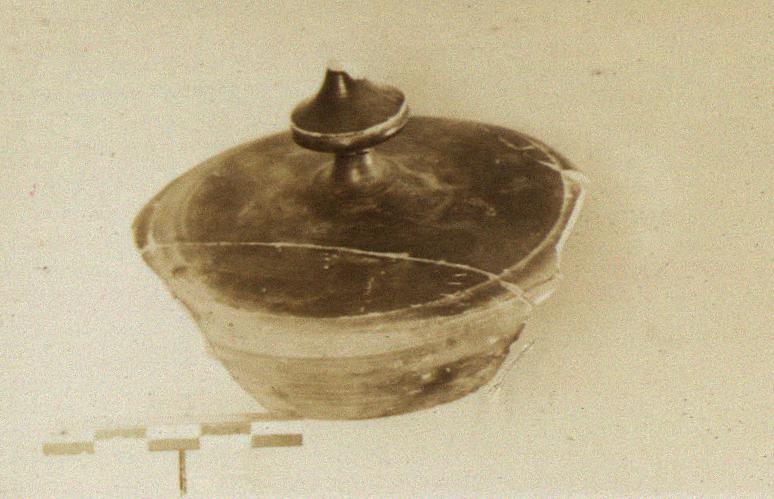 | Description: | Much of rim missing; tip of knob missing. Lid flat on top, with high moulded central knob; deep downturned rim. Ridge around top, near edge. Black glaze inside and out, much grayed inside. For a similar bowl, cf. P 10078 (Χ 654). | |