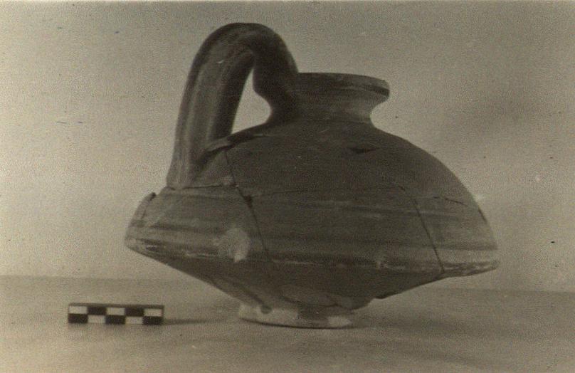 | Description: | Fragment of lip and bits of wall and base missing. Ring foot; shallow flaring lower wall meeting deep convex shoulder at a sharp angle; short neck; round mouth with projecting vertical-faced lip; two double rolled handles, set close together on lip and rising above it; lower attachments set well apart on middle of shoulder. Red glaze wash inside and out, not reaching to the bottom outside. Darker red for lip and handles, and for bands around body at shoulder. Same as P 9428 and P 9431 (from -6.80m.). | |