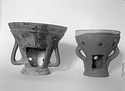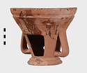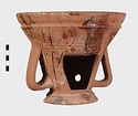 Description:   A small piece of the rim, parts of the base, and both handles, except for one lower attachment, missing. Deep inner bowl with moulded rim and flat bottom. High narrow base on concave foot, with a large rectangular opening on one side, and on the opposite side at least one small round hole. Two vertical handles attached at base of bowl and just above foot.