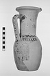 | Description: | Much of body and neck, one handle and all of base missing. Restored in plaster. Slender body; straight neck, outcurving rim with snakes in relief on it; one strap handle with snake, and snakes around shoulder. Glaze mostly gone. On preserved part of neck, to left of handle, a band of S scrolls; parts of four figures in panel below. Starting at right, two female figures holding palm branches facing left, then a male figure holding a lyre(?) facing them. Some object, perhaps a pointed amphora, between him and the last female figure. Behind the male, another female figure facing right holding palm branches. On shoulder, band of hooks; then a wider band, almost illegible, of vertical lines and waves; a horizontal band of lines and herringbone pattern and below this rays and another band of horizontal lines and herringbones. | |