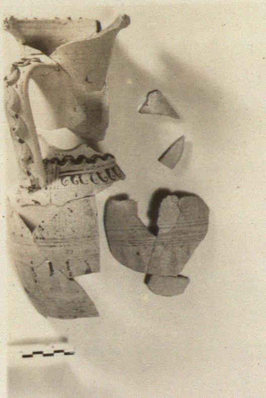 Description:   Much of body and neck, one handle and all of base missing. Restored in plaster. Slender body; straight neck, outcurving rim with snakes in relief on it; one strap handle with snake, and snakes around shoulder. Glaze mostly gone. On preserved part of neck, to left of handle, a band of S scrolls; parts of four figures in panel below. Starting at right, two female figures holding palm branches facing left, then a male figure holding a lyre(?) facing them. Some object, perhaps a pointed amphora, between him and the last female figure. Behind the male, another female figure facing right holding palm branches. On shoulder, band of hooks; then a wider band, almost illegible, of vertical lines and waves; a horizontal band of lines and herringbone pattern and below this rays and another band of horizontal lines and herringbones.
