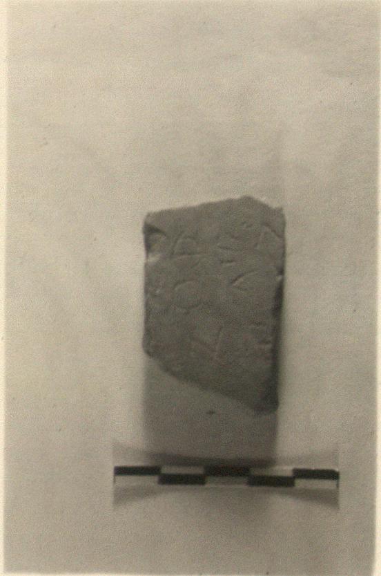 | Description: | Fragment from a plain pot. Incised outside: <graphic> Red clay with white bits; grayish at core. | |