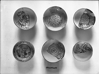 | Description: | Small bowl with vertical rim. Pale green glaze outside; inside a cock in blue with touches of red. To right, guilloches below rim. | |