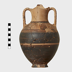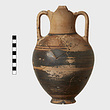 | Description: | Most of lip and fragments of body and base missing. Small flaring ring foot; flaring lip. Lip glazed, neck reserved. Handles, crosshatched; on shoulder, concentric semicircles. Body glazed, with narrow reserved band. | |
